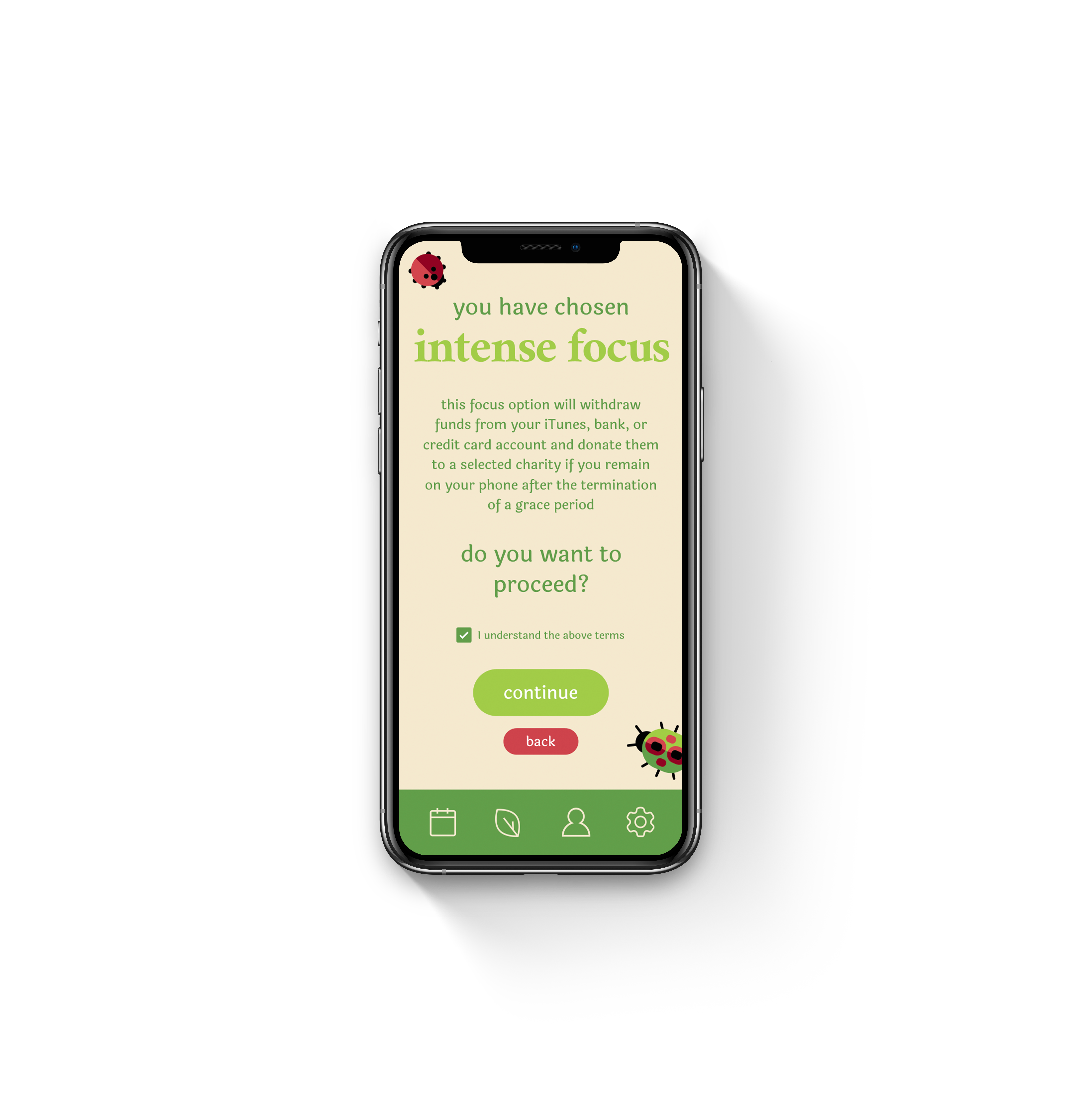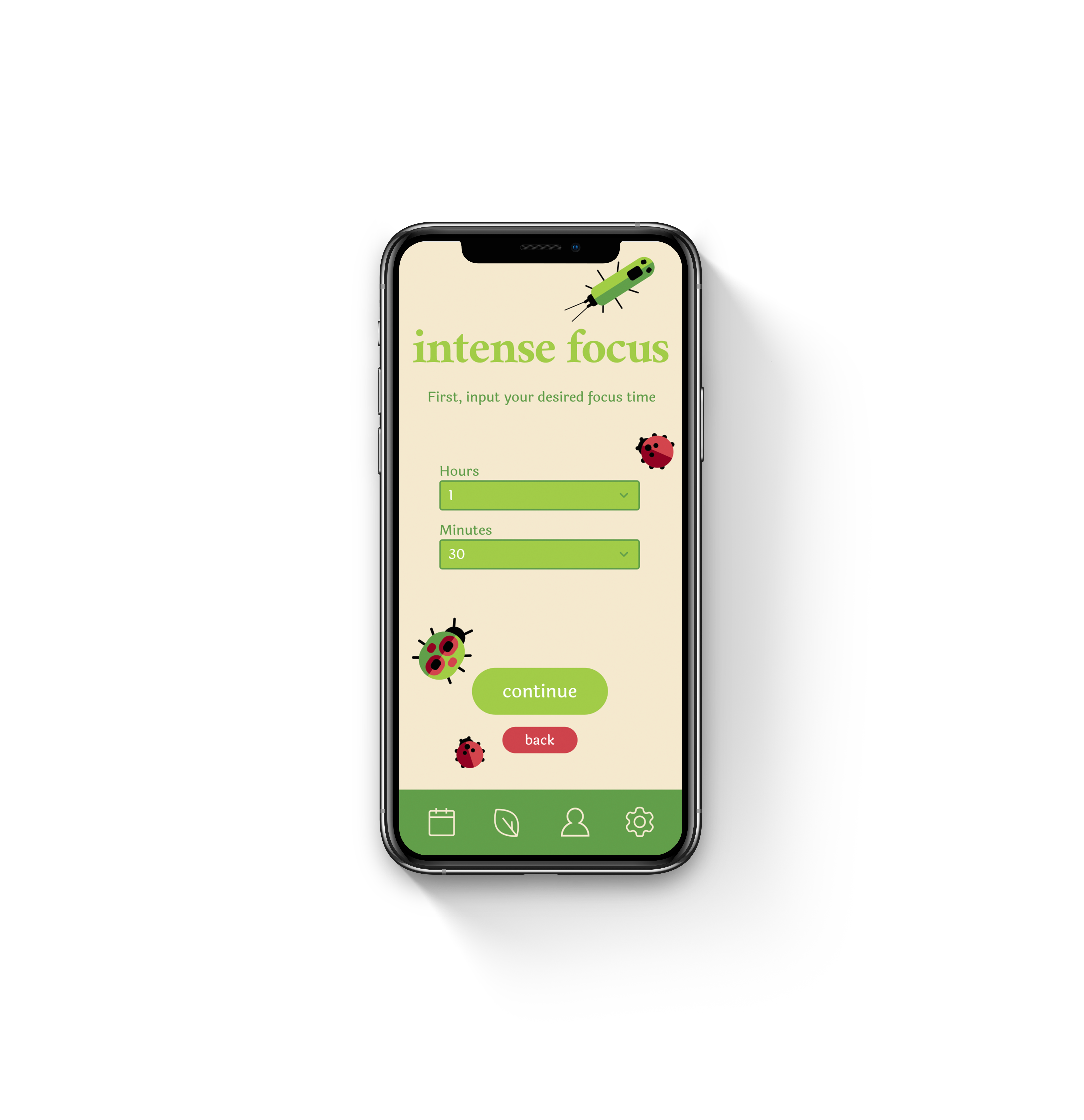In ‘Bug Me’ mode, the user chooses a low-stakes option to prevent procrastination. They set a timer for how long this mode is turned on. As the user is on their phone, bug icons pop up and keep them from interacting with other apps or functions while they’re supposed to be focusing on other tasks.