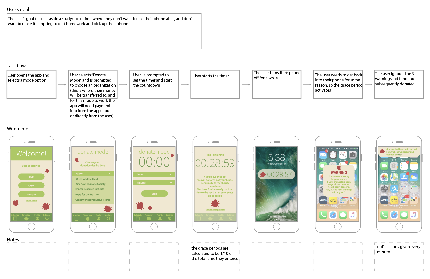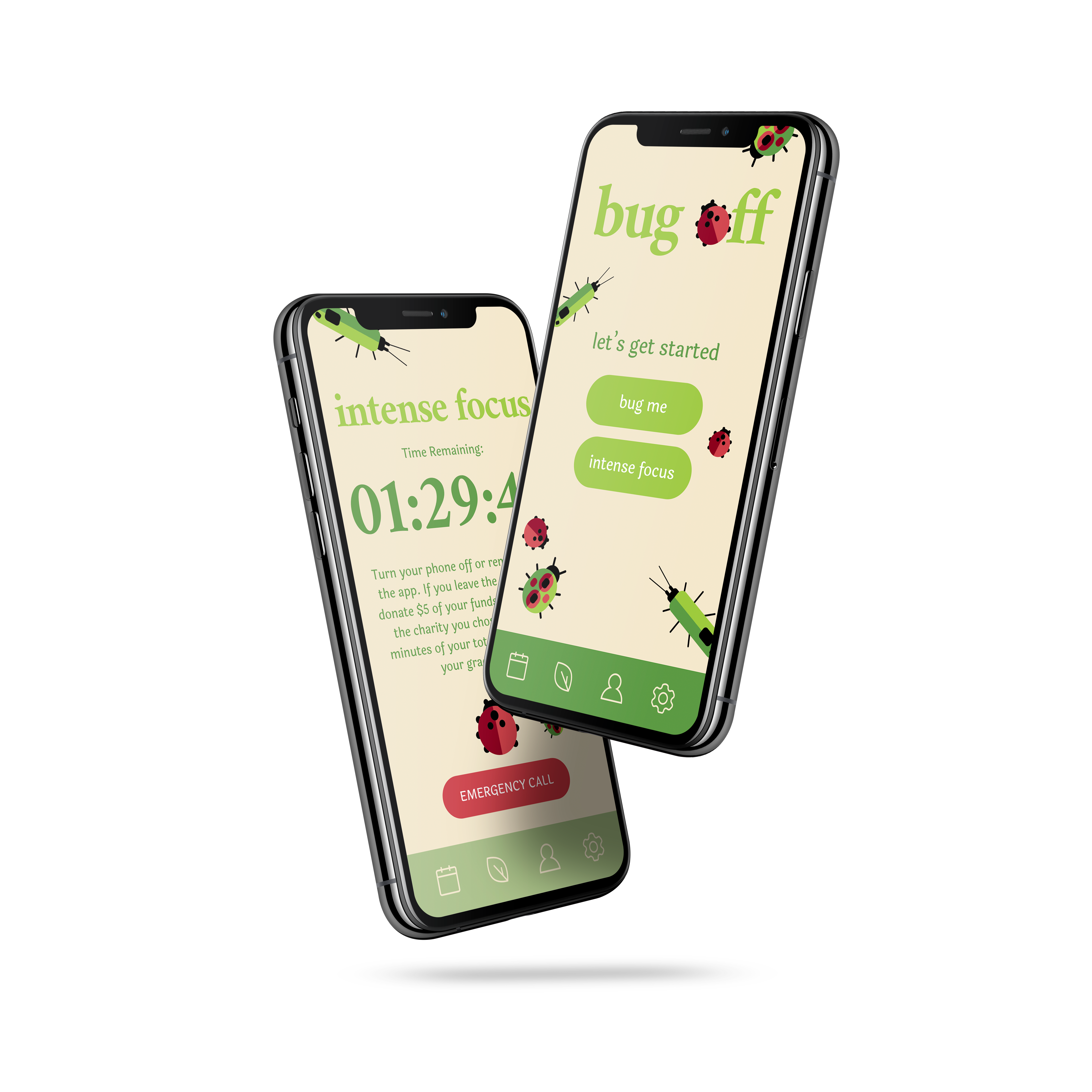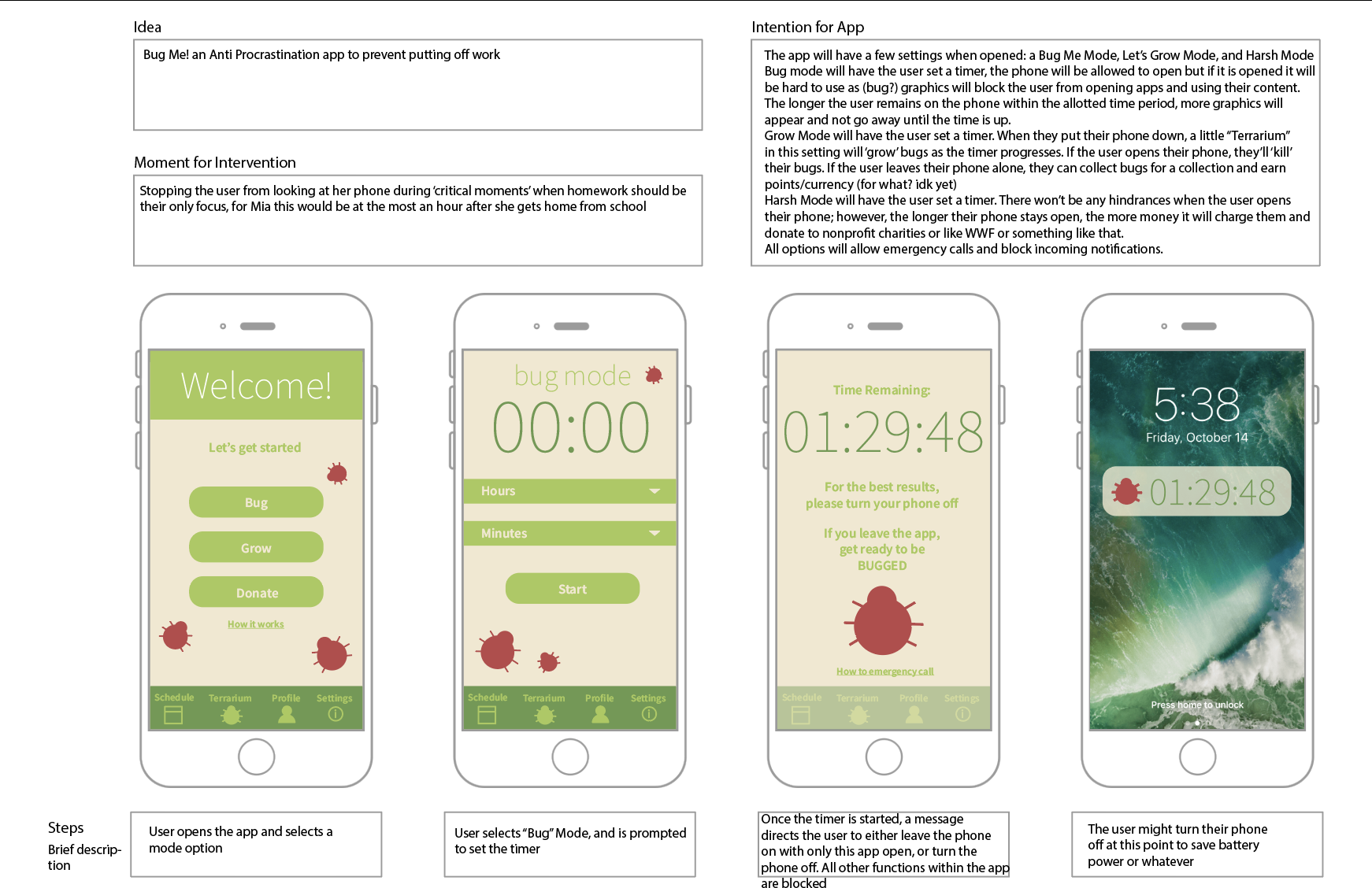 Bug Off is an anti-procrastination app designed to force you off your phone through deterrants. There are two final modes to choose from (grow was rejected to keep this application from being too similar to a game).