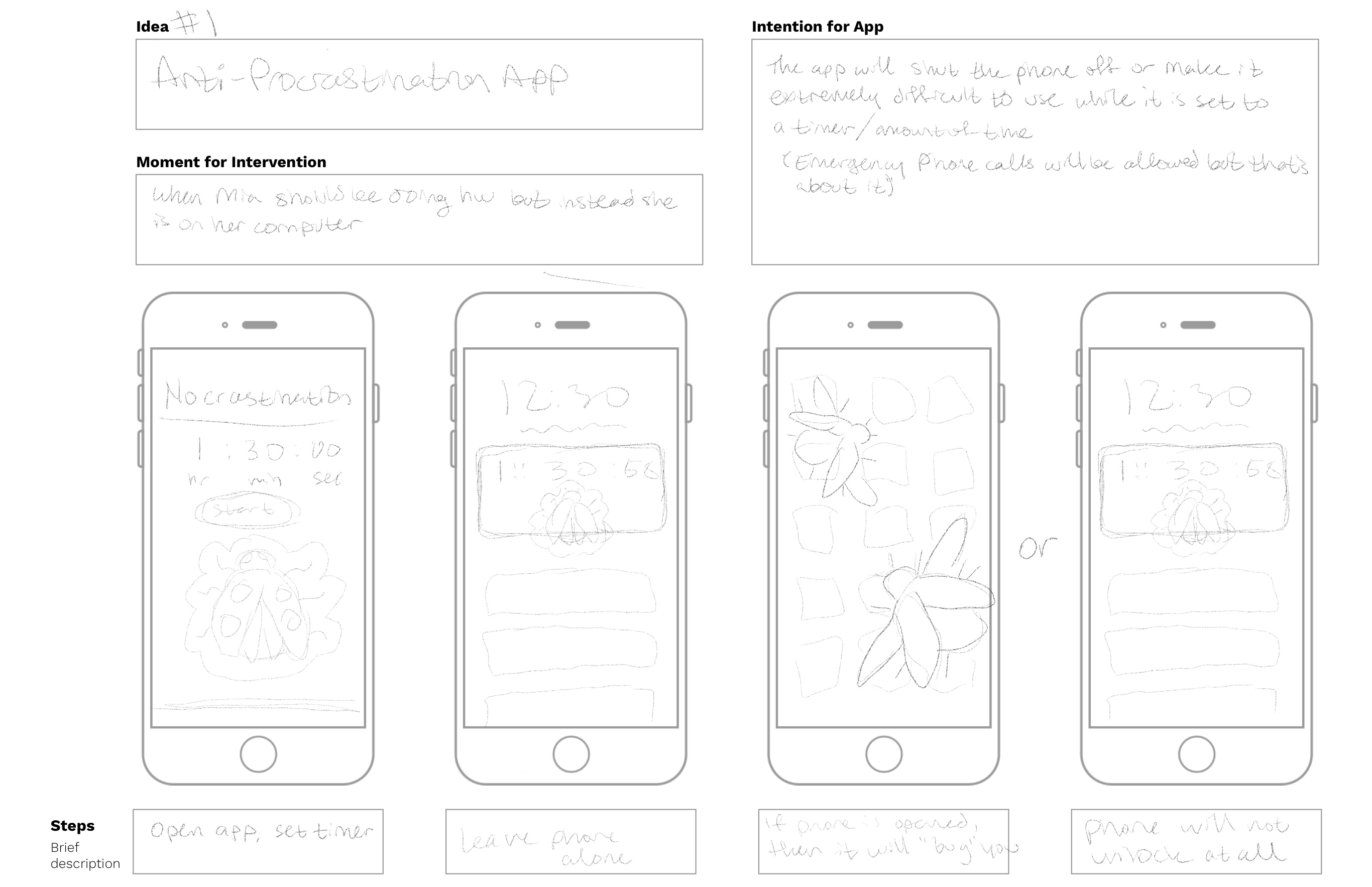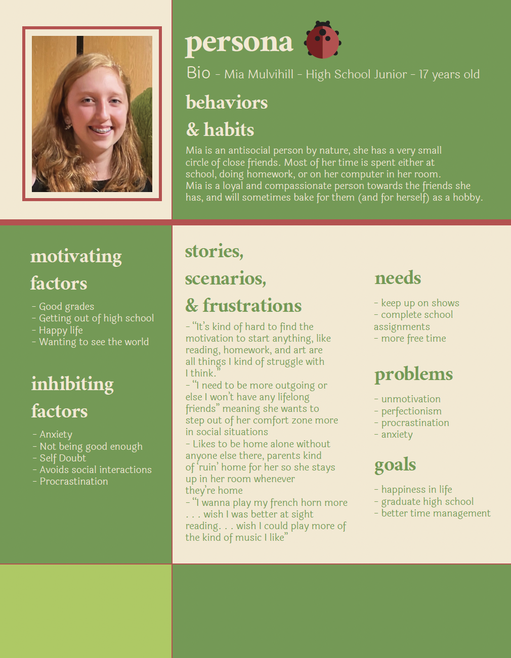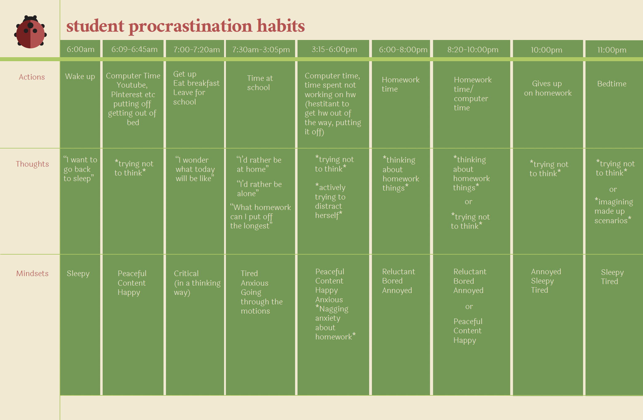 This project required a deep understanding of my audience-- mainly the specific ‘persona’ I was designing for. I created an indentity and habit sheet that tracked their thoughts and needs surrounding procrastination.
