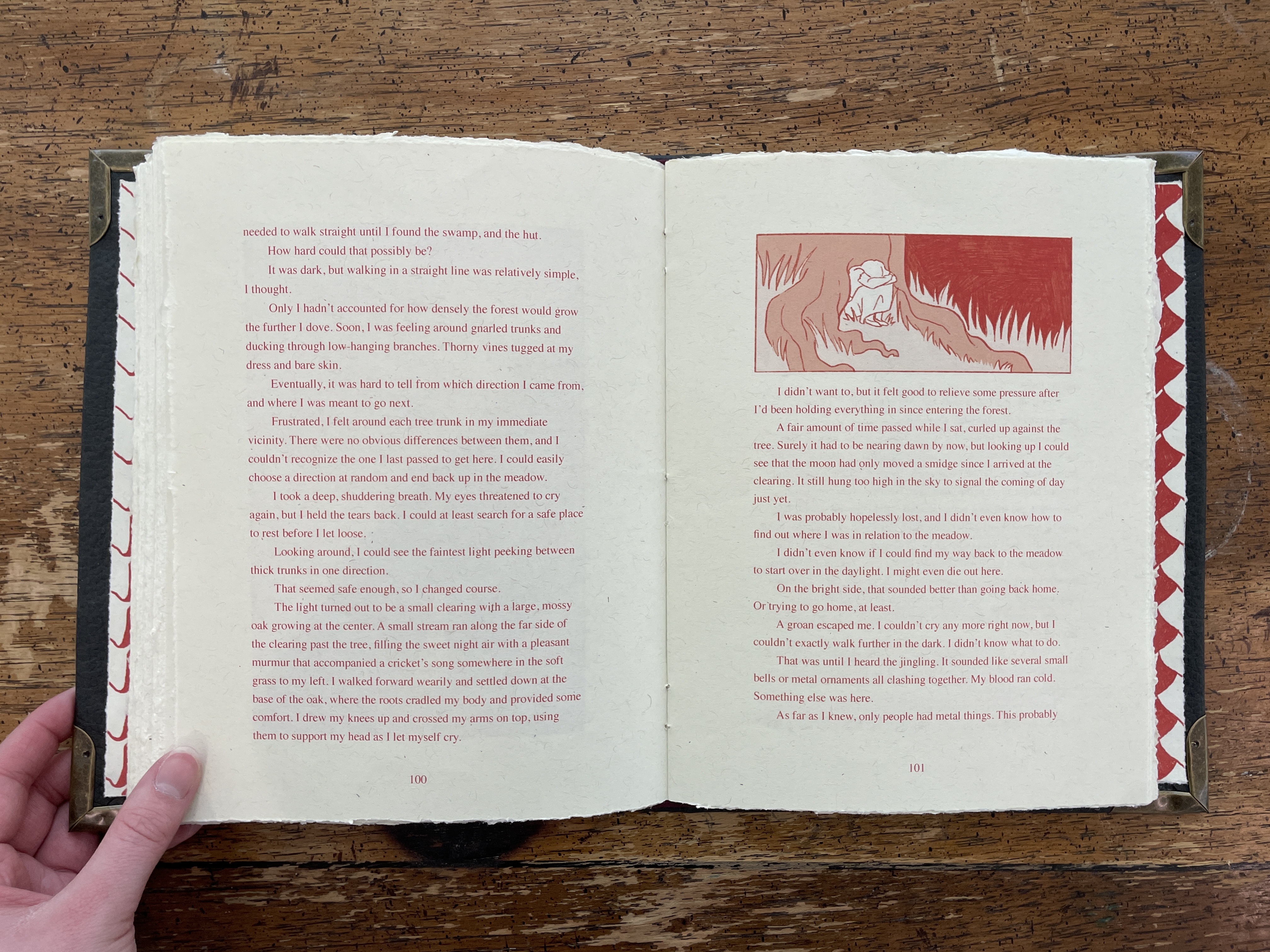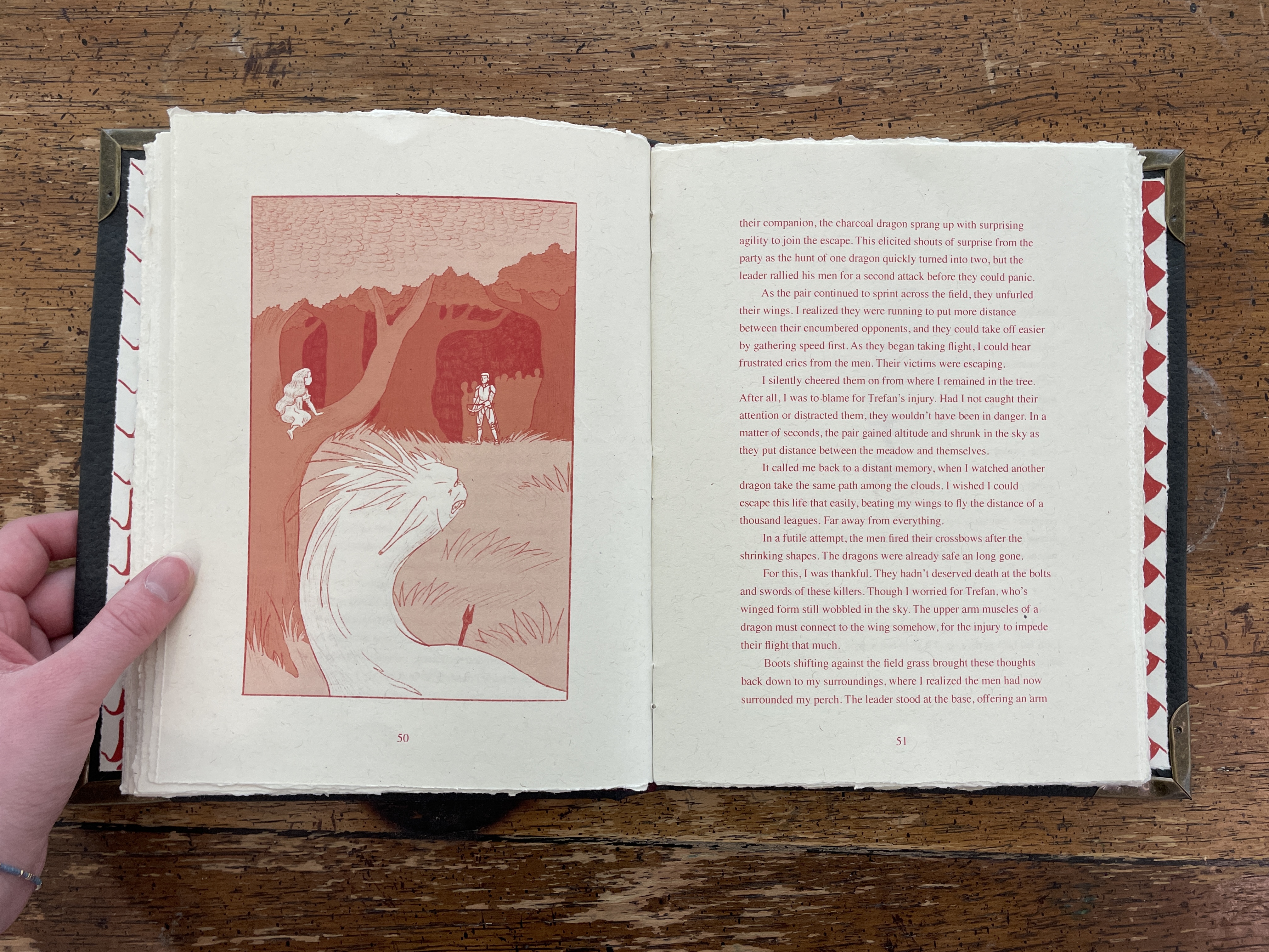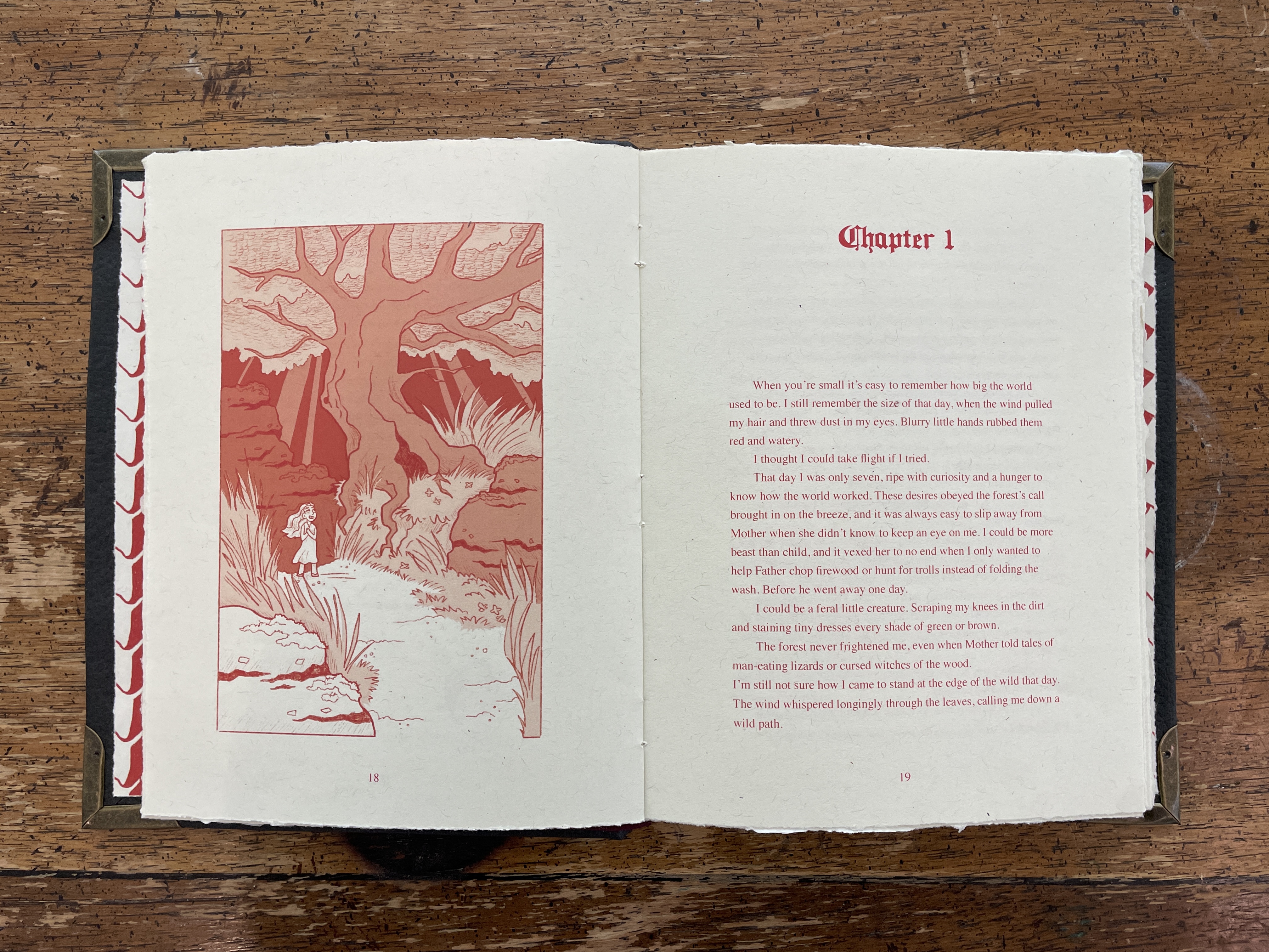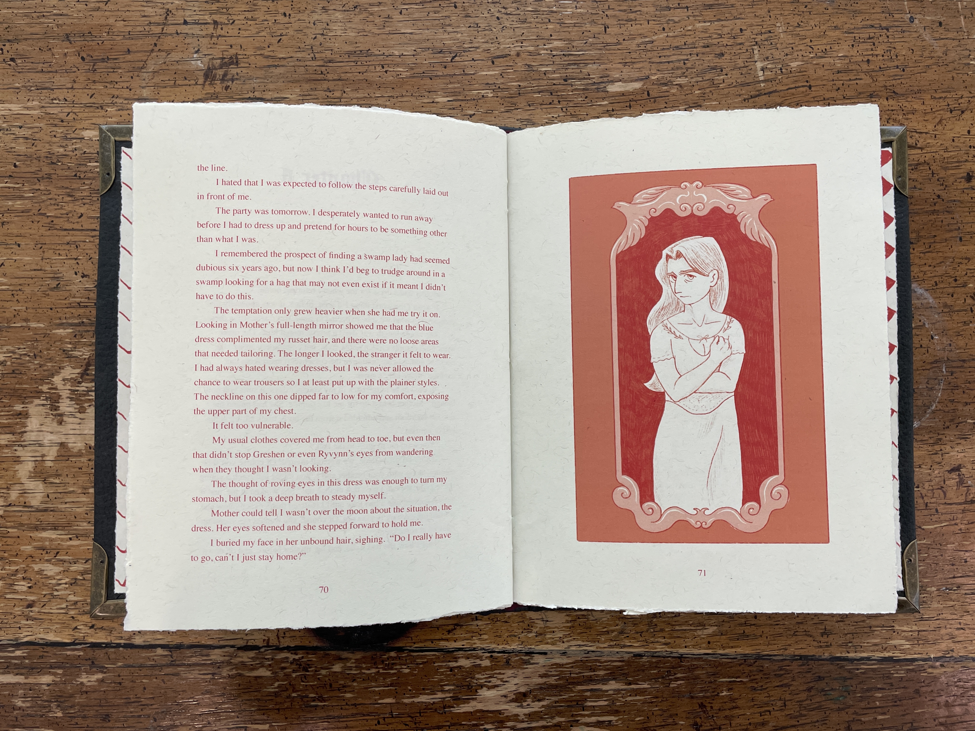 The ultimate product of my senior project ended up including writing, illustrating, formatting, and creating a speculative publishing identity for my very own 22,000-word approximately 100-page novella that utilizes reflective fiction.I wrote this story to shed light on struggles with gender identity and roles-- even going so far to include my own experiences.