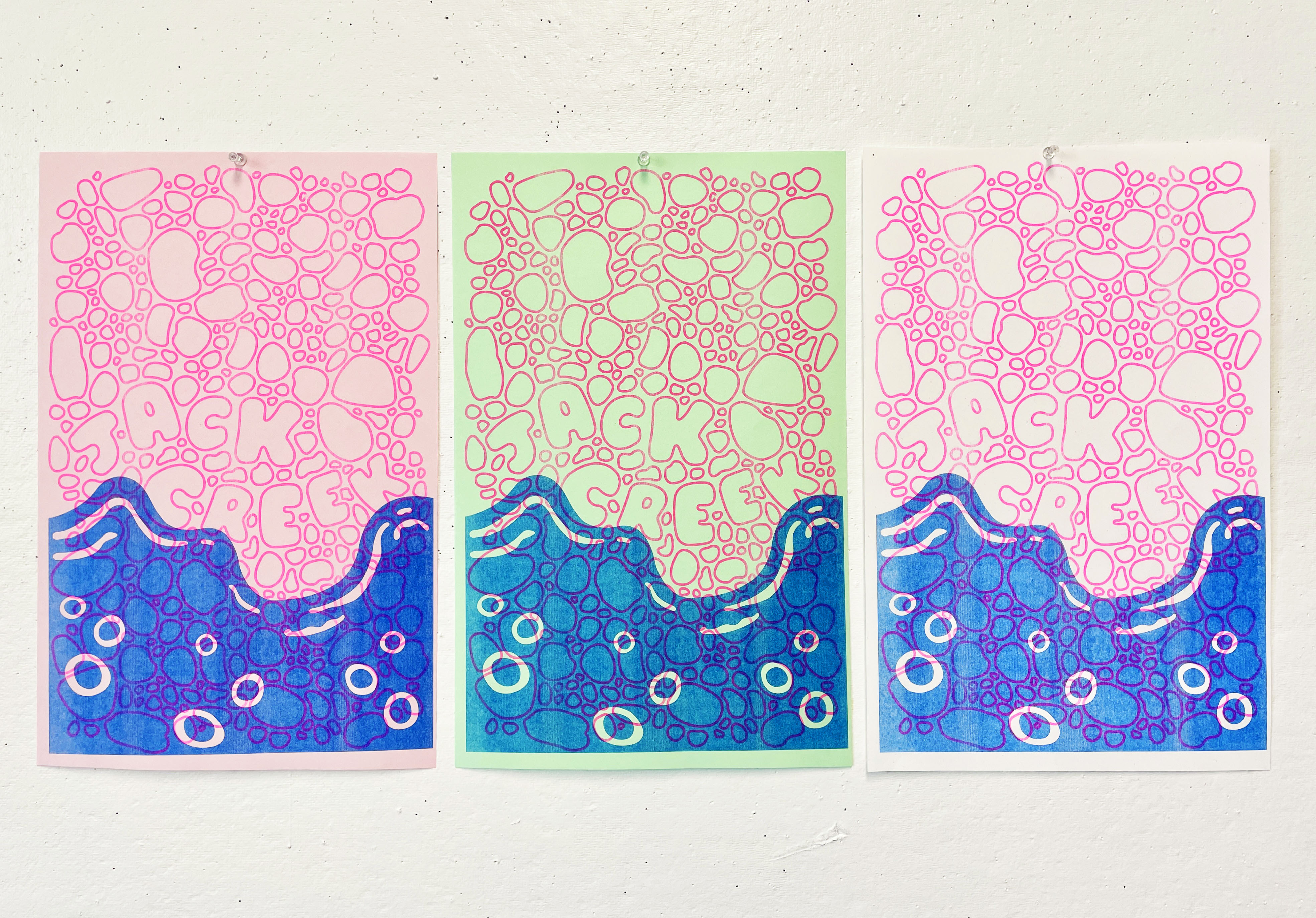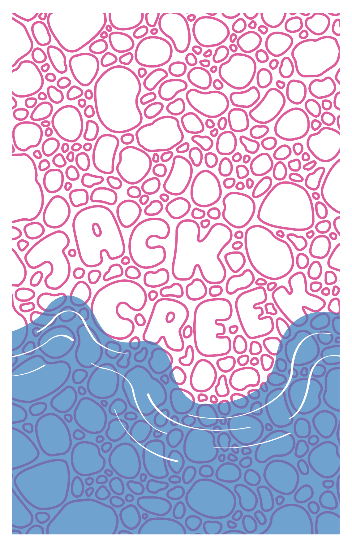This project involved translating a physical location into a RISO poster meant to promote the area and its surroundings. The design of the poster itself was developed typographically. Using the natural shapes of stones found in the creek bed, the text blends into the illustrated shore.