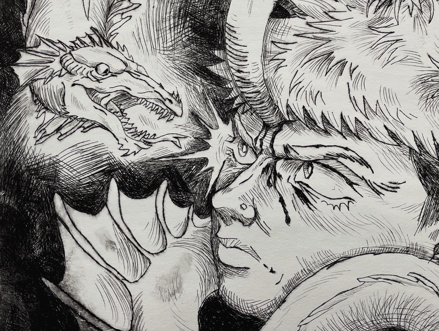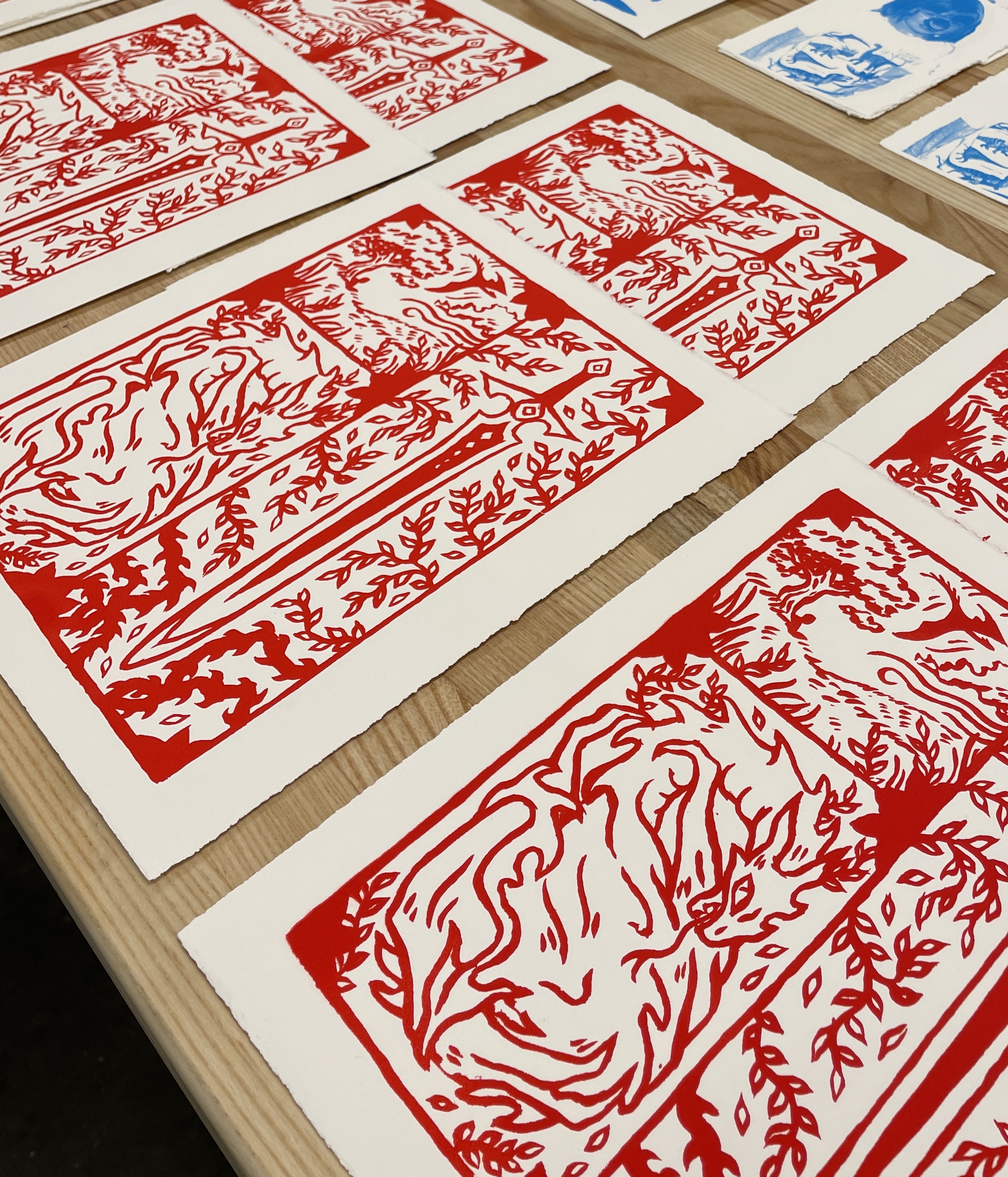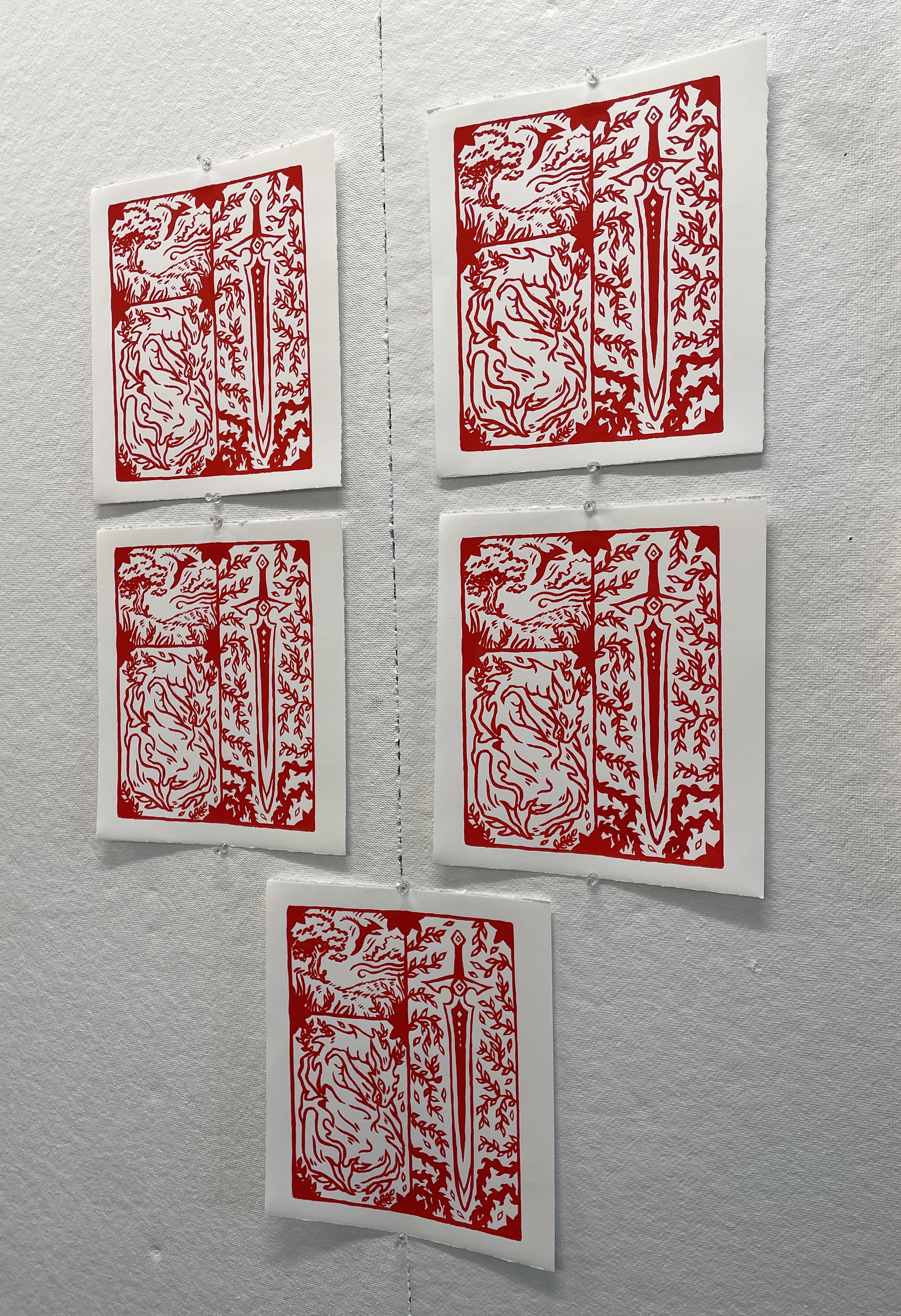 A drawing fluid screenprinting project depicting a panelled, fantasy-themed illustration of a dragon, longsword, and scene accented by thorn and leaf embellishments along the frames.