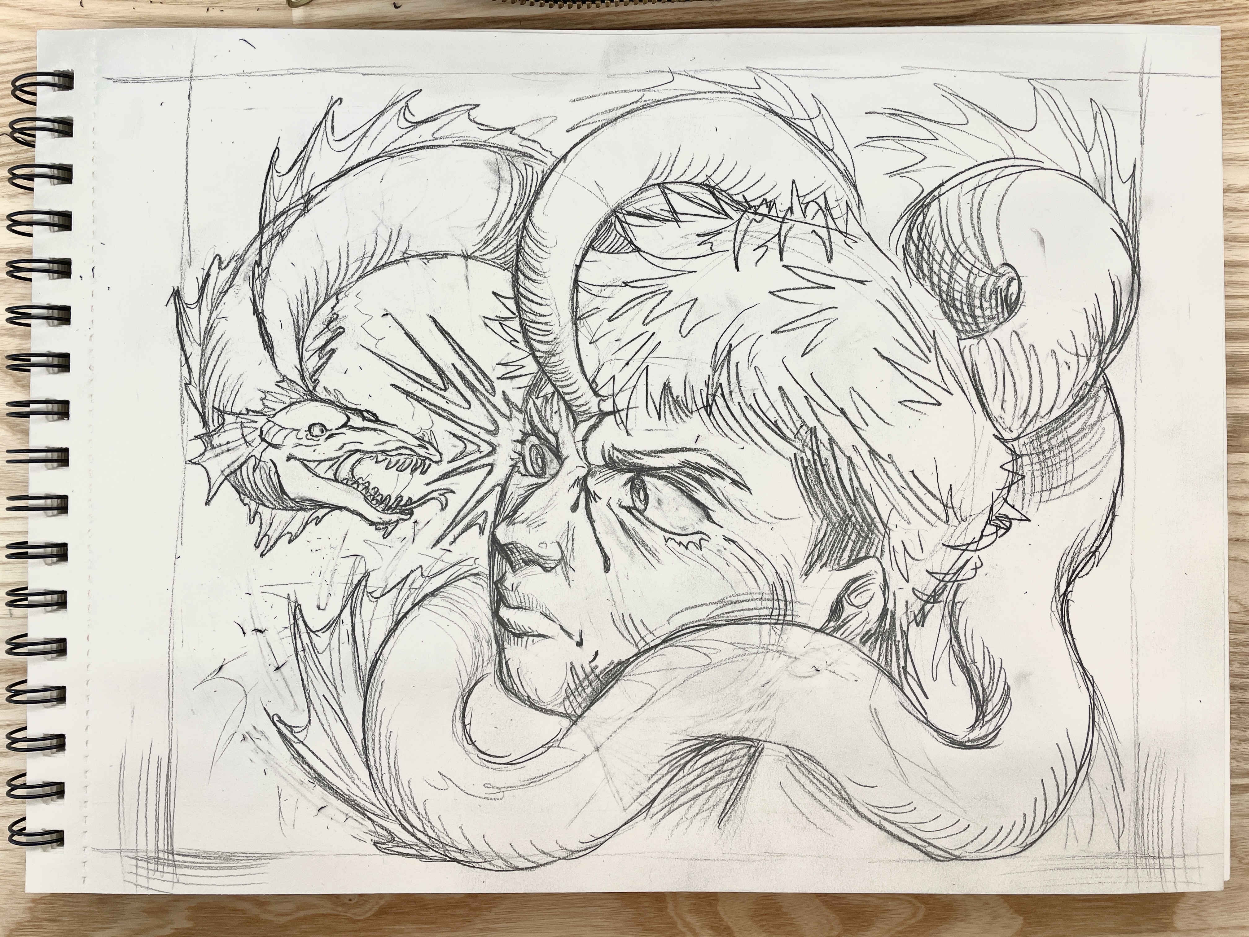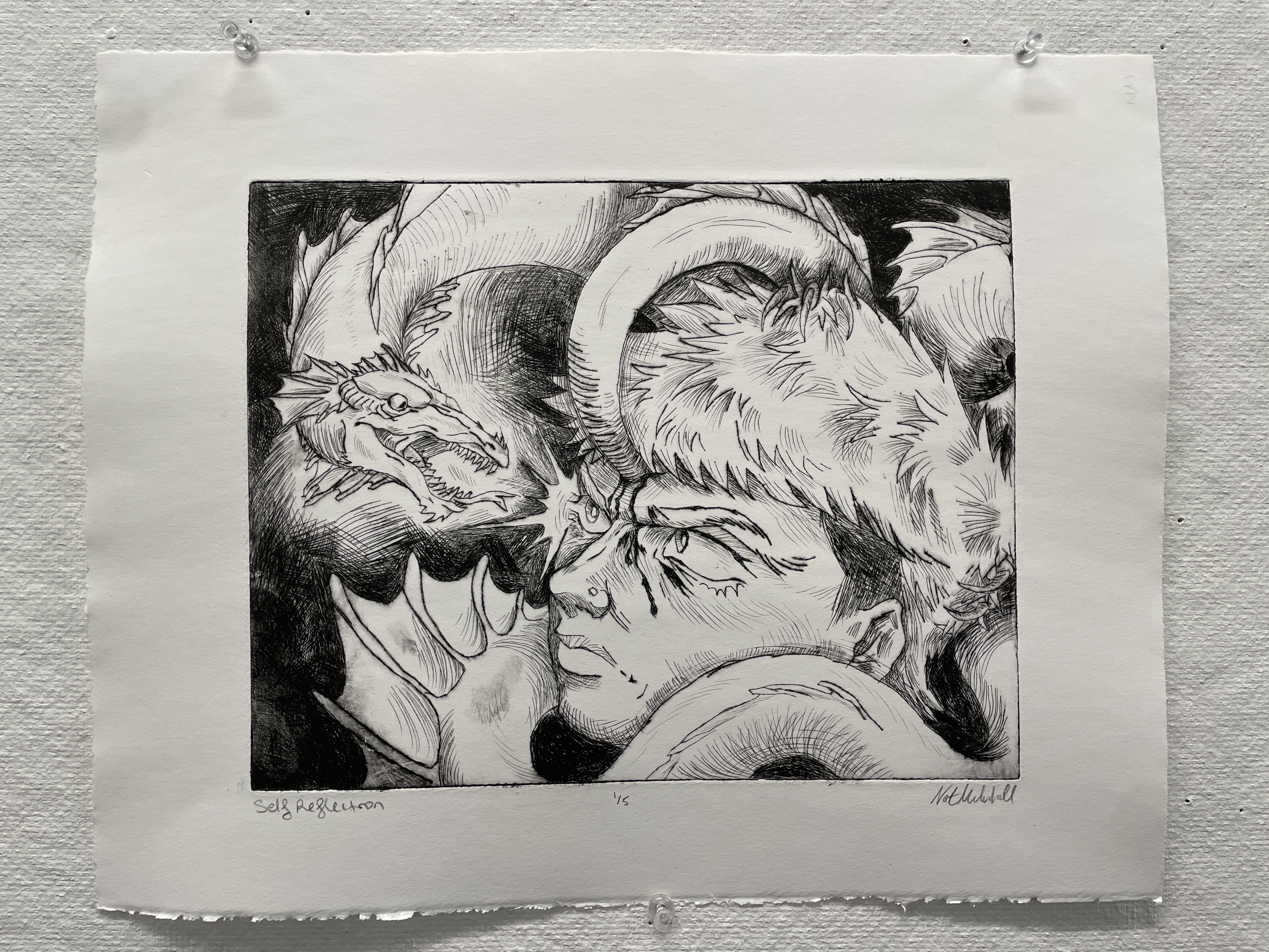 Made using the printmaking technique of intaglio scratching. The imagery represents self criticism through the creature emerging from the subject’s head and baring its teeth.